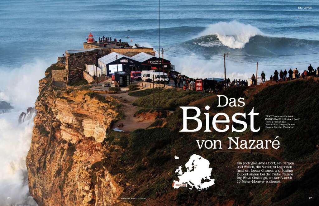 Der Startschuss für die Tudor Nazaré Big Wave Challenge fiel am 14. Dezember, als der Atlantik vor dem Praia do Norte einige der größten Wettkampfwellen aller Zeiten lieferte. Über 10.000 Zuschauer säumten die Klippen von Nazaré, um diesem Spektakel beizuwohnen.