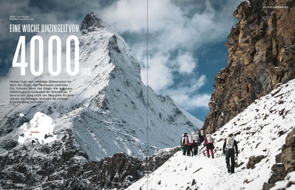 Der Morgen in Zermatt riecht nach Frost und Adrenalin. Der Wind zieht über die Dächer, während sich das Team von The North Face in der Morgendämmerung fertig macht. Beim Frühstücksbriefing wurde die Ausrüstung besprochen, vieles davon für einige des Teams kein daily business: Klettergurt, Steigeisen, Eispickel und das Advanced Mountain Kit.